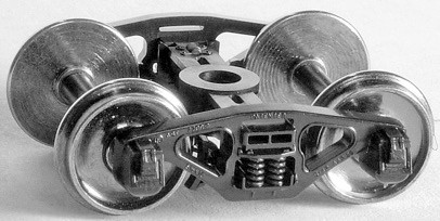 Tahoe Model Works trucks feature one-piece black acetal plastic moldings with separate brake shoe detail, and non-magnetic, insulated metal 0.110" wide RP-25 contour wheelsets. The Barber Lateral Motion device used steel rollers and a roller seat between the bolster and springs to provide a little side-to-side movement of the car body to the track, resulting in a smoother ride. U-section trucks with this feature were manufactured from the early 1920s to the late 1930s.